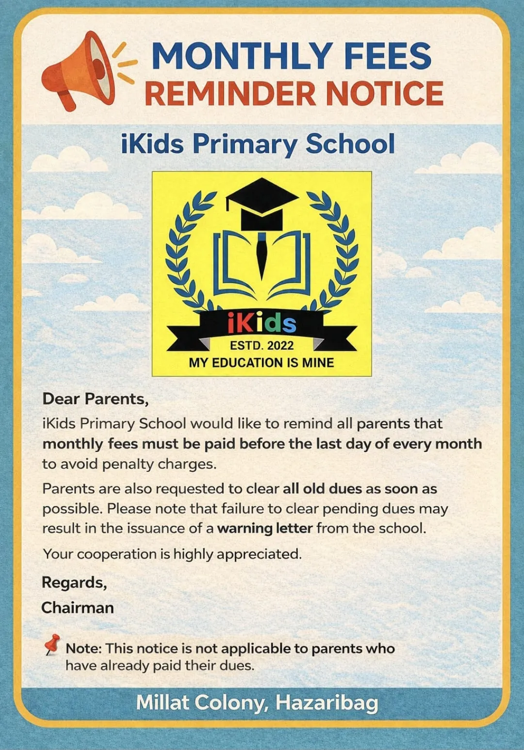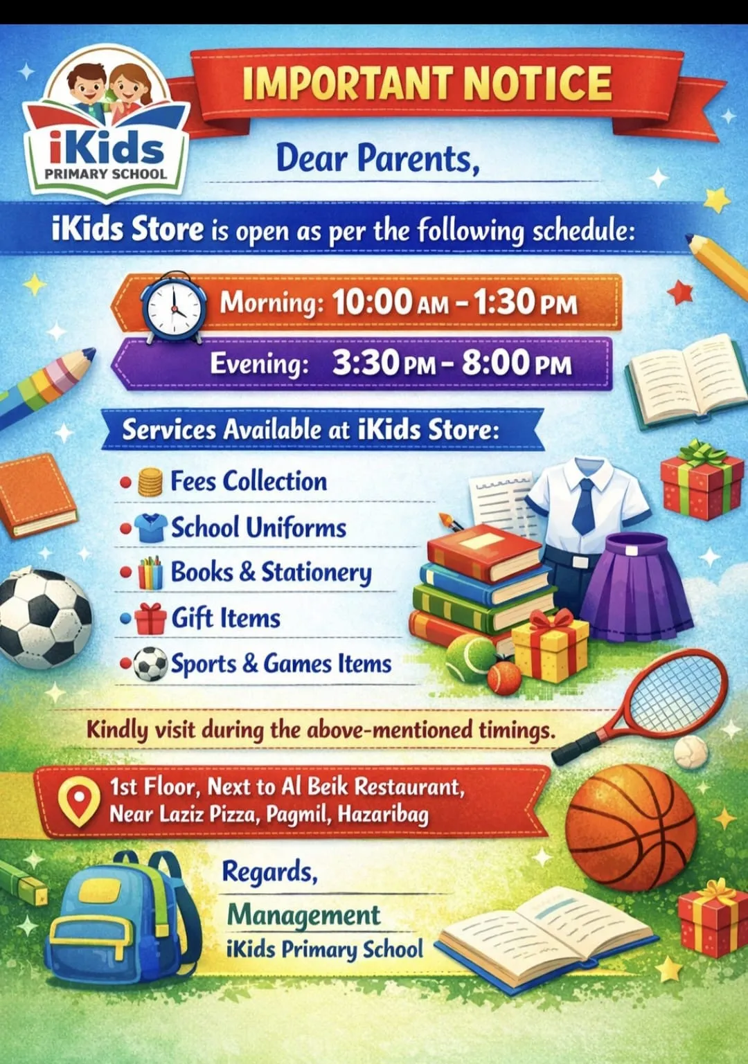 Welcome to iKids Primary School – the first Islamic-based English medium school in Hazaribagh. Our mission is to provide quality education rooted in moral values and Islamic teachings. We aim to nurture confident, responsible, and spiritually aware children who are ready to lead tomorrow. Thank you for being a part of this meaningful journey.